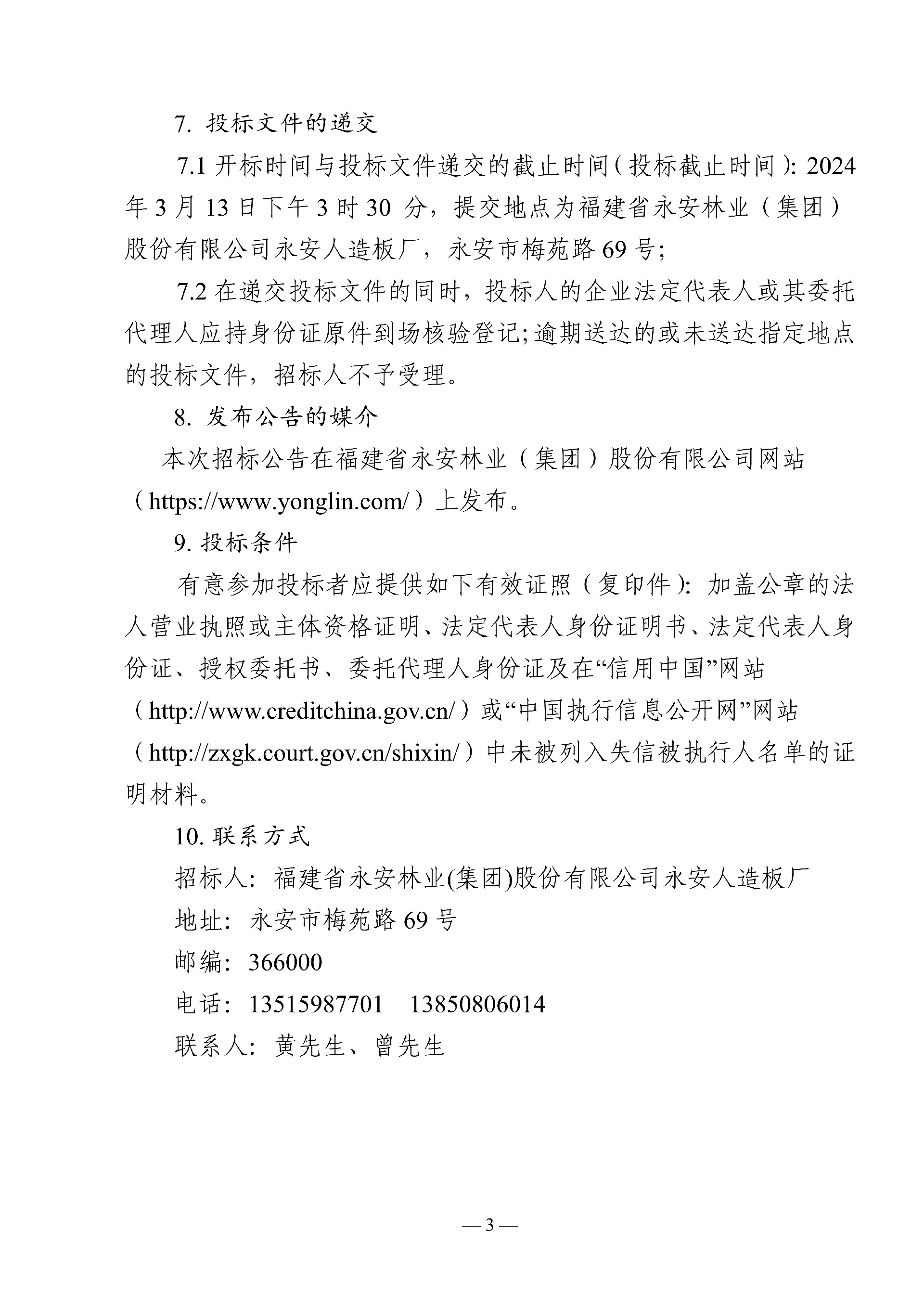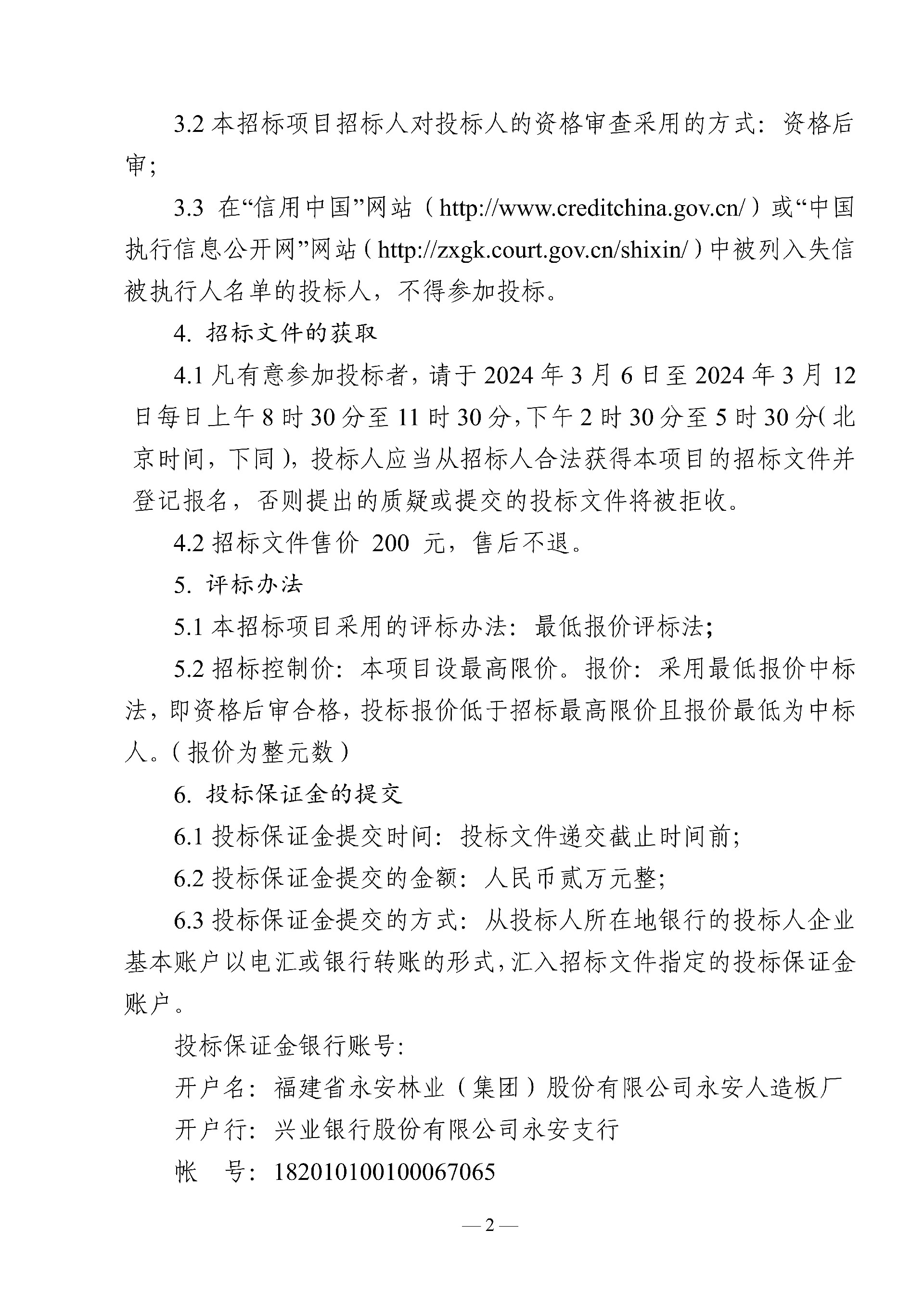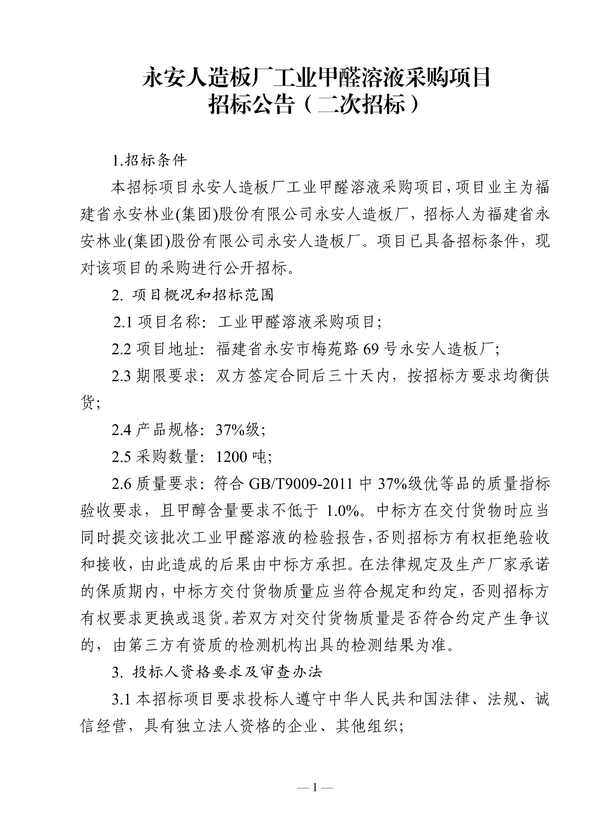 永安人造板廠工業甲醛溶液采購項目招標公告(二次招標)