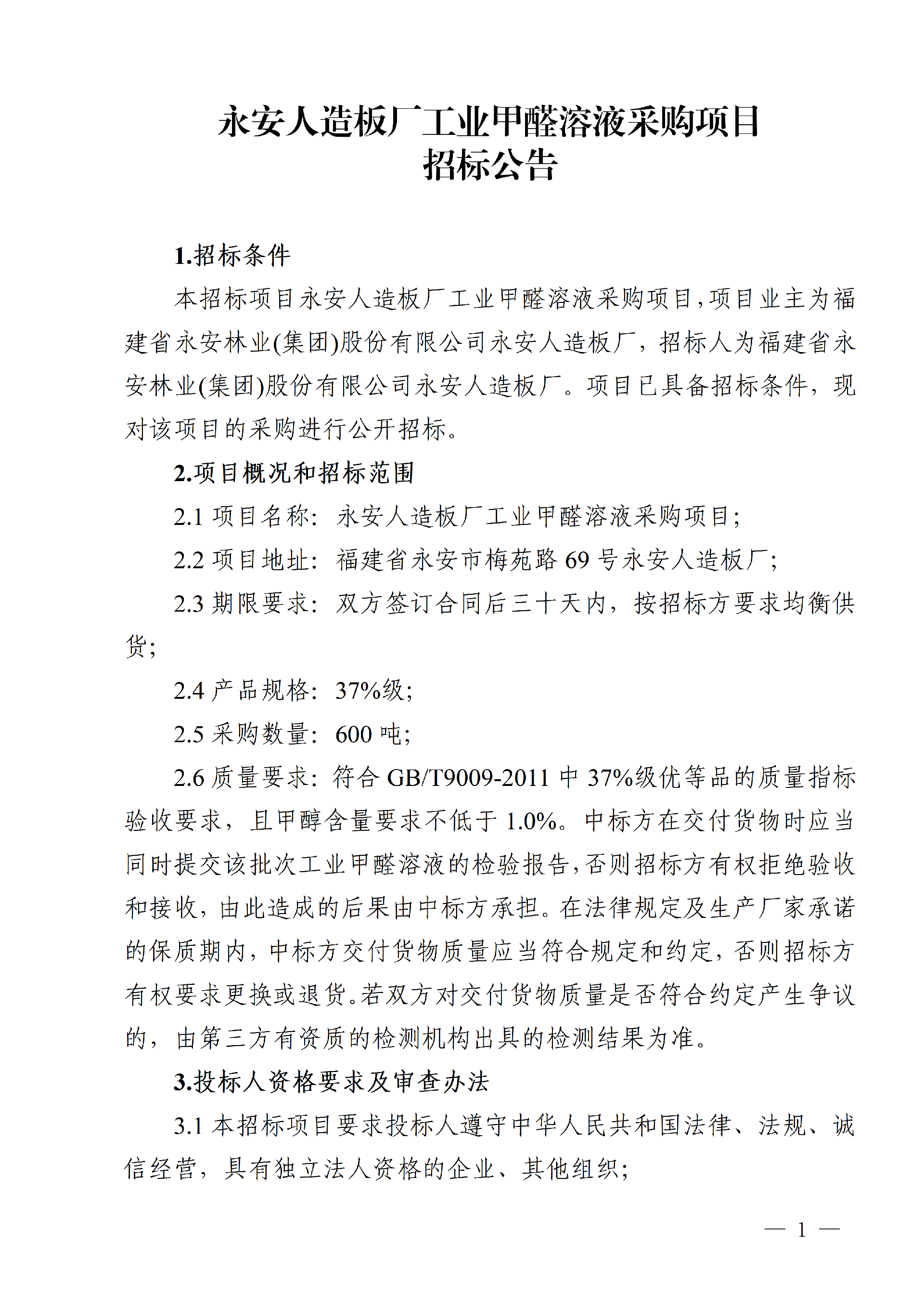 永安人造板廠工業(yè)甲醛溶液采購項目招標(biāo)公告