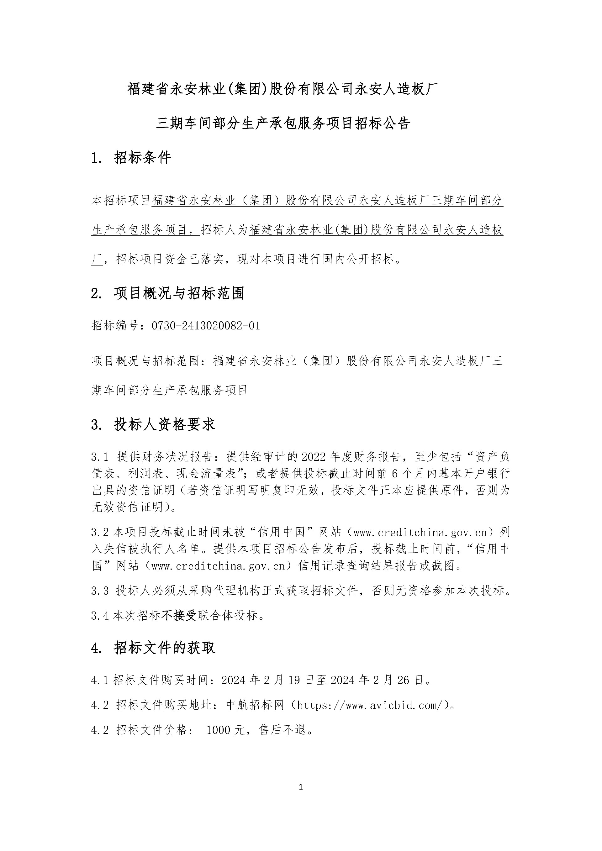 永安人造板廠三期車間部分生產(chǎn)承包服務(wù)項目招標(biāo)公告